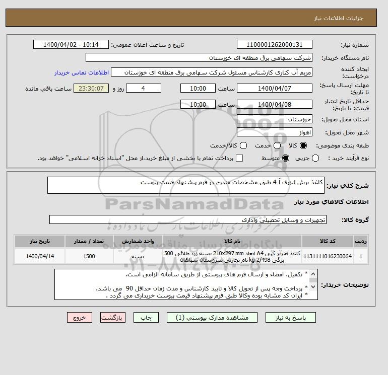 استعلام کاغذ برش لیزری آ 4 طبق مشخصات مندرج در فرم پیشنهاد قیمت پیوست , استعلام کاغذ برش لیزری آ 4 طبق مشخصات مندرج در فرم پیشنهاد قیمت پیوست