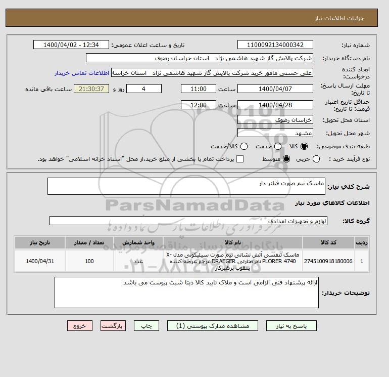 نام دستگاه خریدار:شرکت پالایش گاز شهید هاشمی نژاد استان خراسان رضوی