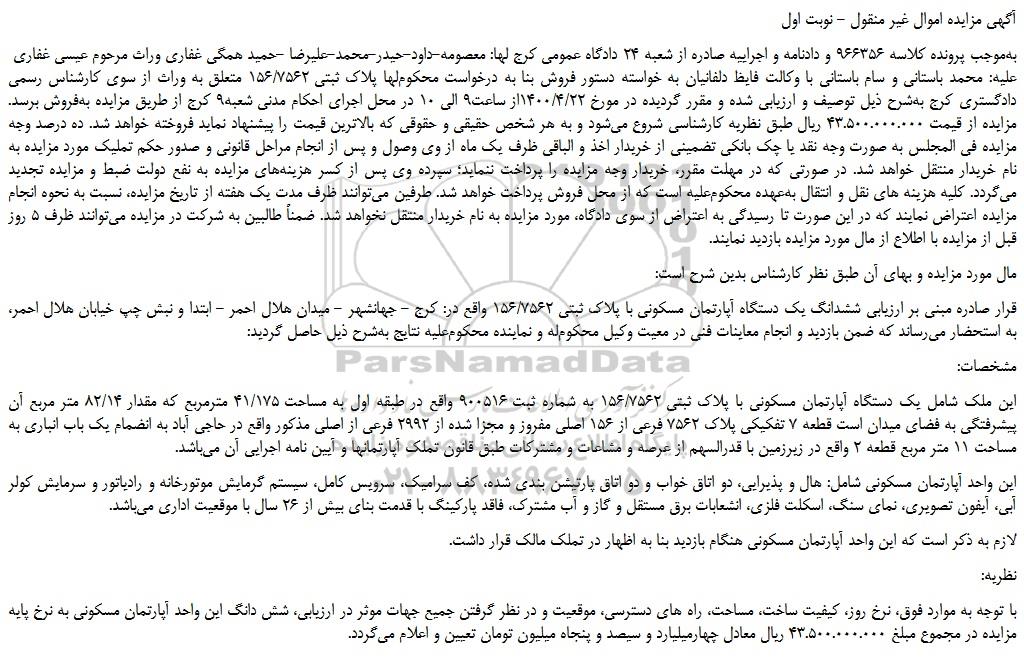 به موجب پرونده کلاسه 966356 و دادنامه و اجراییه صادره از شعبه 24 دادگاه عمومی کرج لها: معصومه-داود-حیدر-محمد-علیرضا -حمید همگی غفاری وراث مرحوم عیسی غفاری علیه: محمد باستانی و سام باستانی با وکالت فایظ دلفانیان به خواسته دستور فروش بنا به درخواست محکوم لها پلاک ثبتی 156/7562 متعلق به وراث از سوی کارشناس رسمی دادگستری کرج به شرح ذیل توصیف و ارزیابی شده و مقرر گردیده در مورخ 1400/4/22از ساعت9 الی 10 در محل اجرای احکام مدنی شعبه9 کرج از طریق مزایده به فروش برسد. مزایده از قیمت 43.500.000.000 ریال طبق نظریه کارشناسی شروع می شود و به هر شخص حقیقی و حقوقی که بالاترین قیمت را پیشنهاد نماید فروخته خواهد شد. ده درصد وجه مزایده فی المجلس به صورت وجه نقد یا چک بانکی تضمینی از خریدار اخذ و الباقی ظرف یک ماه از وی وصول و پس از انجام مراحل قانونی و صدور حکم تملیک مورد مزایده به نام خریدار منتقل خواهد شد. در صورتی که در مهلت مقرر، خریدار وجه مزایده را پرداخت ننماید؛ سپرده وی پس از کسر هزینه های مزایده به نفع دولت ضبط و مزایده تجدید می گردد. کلیه هزینه های نقل و انتقال به عهده محکوم علیه است که از محل فروش پرداخت خواهد شد. طرفین می توانند ظرف مدت یک هفته از تاریخ مزایده، نسبت به نحوه انجام مزایده اعتراض نمایند که در این صورت تا رسیدگی به اعتراض از سوی دادگاه، مورد مزایده به نام خریدار منتقل نخواهد شد. ضمناً طالبین به شرکت در مزایده می توانند ظرف 5 روز قبل از مزایده با اطلاع از مال مورد مزایده بازدید نمایند.