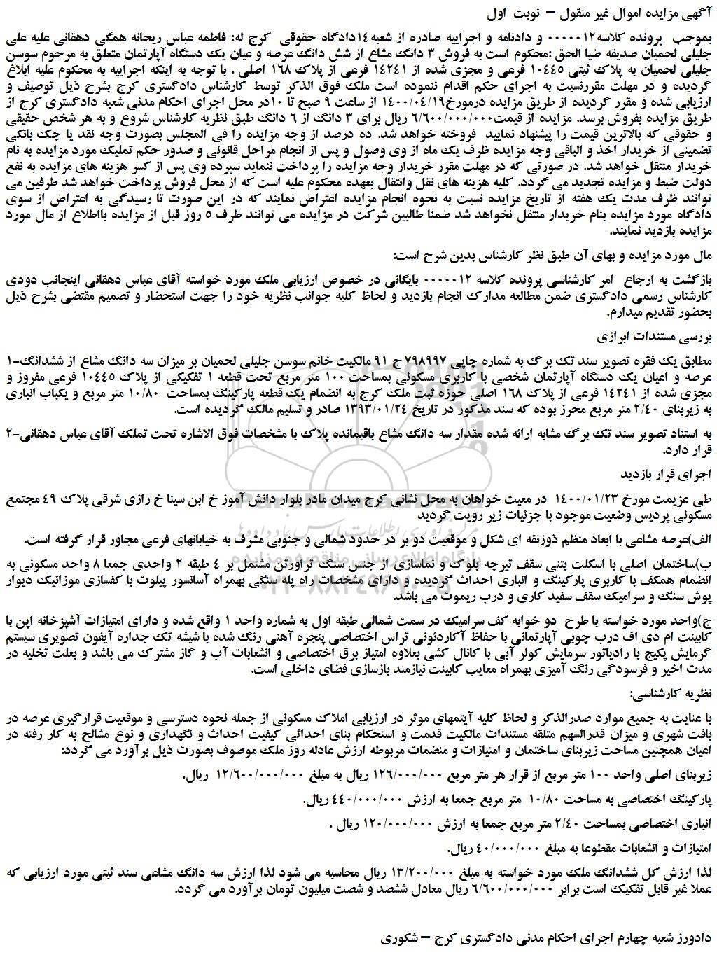 بموجب پرونده کلاسه0000012 و دادنامه و اجراییه صادره از شعبه14دادگاه حقوقی کرج له: فاطمه عباس ریحانه همگی دهقانی علیه علی جلیلی لحمیان صدیقه ضیا الحق :محکوم است به فروش 3 دانگ مشاع از شش دانگ عرصه و عیان یک دستگاه آپارتمان متعلق به مرحوم سوسن جلیلی لحمیان به پلاک ثبتی 10445 فرعی و مجزی شده از 14241 فرعی از پلاک 168 اصلی . با توجه به اینکه اجراییه به محکوم علیه ابلاغ گردیده و در مهلت مقررنسبت به اجرای حکم اقدام ننموده است ملک فوق الذکر توسط کارشناس دادگستری کرج بشرح ذیل توصیف و ارزیابی شده و مقرر گردیده از طریق مزایده درمورخ1400/04/19 از ساعت 9 صبح تا 10در محل اجرای احکام مدنی شعبه دادگستری کرج از طریق مزایده بفروش برسد. مزایده از قیمت6/600/000/000 ریال برای 3 دانگ از 6 دانگ طبق نظریه کارشناس شروع و به هر شخص حقیقی و حقوقی که بالاترین قیمت را پیشنهاد نمایید فروخته خواهد شد. ده درصد از وجه مزایده را فی المجلس بصورت وجه نقد یا چک بانکی تضمینی از خریدار اخذ و الباقی وجه مزایده ظرف یک ماه از وی وصول و پس از انجام مراحل قانونی و صدور حکم تملیک مورد مزایده به نام خریدار منتقل خواهد شد. در صورتی که در مهلت مقرر خریدار وجه مزایده را پرداخت ننماید سپرده وی پس از کسر هزینه های مزایده به نفع دولت ضبط و مزایده تجدید می گردد. کلیه هزینه های نقل وانتقال بعهده محکوم علیه است که از محل فروش پرداخت خواهد شد طرفین می توانند ظرف مدت یک هفته از تاریخ مزایده نسبت به نحوه انجام مزایده اعتراض نمایند که در این صورت تا رسیدگی به اعتراض از سوی دادگاه مورد مزایده بنام خریدار منتقل نخواهد شد ضمنا طالبین شرکت در مزایده می توانند ظرف 5 روز قبل از مزایده بااطلاع از مال مورد مزایده بازدید نمایند.