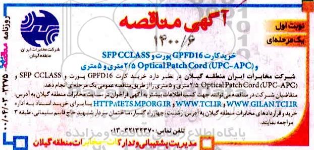 خرید کارت GPFD16 پورت و SFPC CLASS و OPTICAL PATCH CORD (UPC-APC) 2.5 متری و 5 متری را از طریق مناقصه عمومی یک مرحله ای انجام دهد. متقاضیان شرکت در مناقصه می توانند جهت کسب اطلاعات بیشتر به این آگهی فراخوان در سایت مخابرات منطقه گیلان به آدرس WWW.GILAN.TCI.IR و WWW.TCI.IR و HTTP://IETS.MPORG.IR یا برای خرید اسناد به اداره خرید و قراردادهای مخابرات منطقه گیلان به آدرس رشت، چهارراه گلسار، ساختمان سردار شهید حاج قاسم سلیمانی طبقه 3 مراجعه نمایند