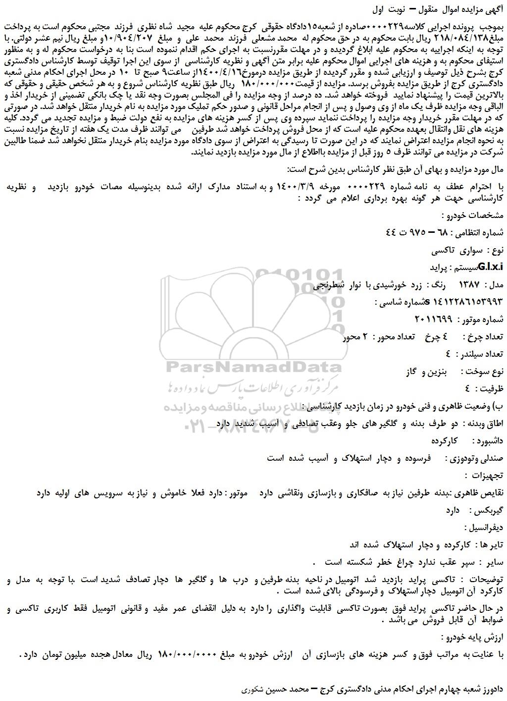 بموجب  پرونده اجرایی کلاسه0000229صادره از شعبه15دادگاه حقوقی  کرج محکوم علیه  مجید  شاه نظری  فرزند  مجتبی محکوم است به پرداخت مبلغ218/084/138 ریال بابت محکوم به در حق محکوم له  محمد مشعلی  فرزند  محمد  علی  و  مبلغ  10/904/207و مبلغ ریال نیم عشر دولتی. با توجه به اینکه اجراییه به محکوم علیه ابلاغ گردیده و در مهلت مقررنسبت به اجرای حکم اقدام ننموده است بنا به درخواست محکوم له و به منظور استیفای محکوم به و هزینه های اجرایی اموال محکوم علیه برابر متن آگهی و نظریه کارشناسی  از سوی این اجرا توقیف توسط کارشناس دادگستری کرج بشرح ذیل توصیف و ارزیابی شده و مقرر گردیده از طریق مزایده درمورخ1400/4/16از ساعت9 صبح تا  10 در محل اجرای احکام مدنی شعبه دادگستری کرج از طریق مزایده بفروش برسد. مزایده از قیمت180/000/000  ریال طبق نظریه کارشناس شروع و به هر شخص حقیقی و حقوقی که بالاترین قیمت را پیشنهاد نمایید  فروخته خواهد شد. ده درصد از وجه مزایده را فی المجلس بصورت وجه نقد یا چک بانکی تضمینی از خریدار اخذ و الباقی وجه مزایده ظرف یک ماه از وی وصول و پس از انجام مراحل قانونی و صدور حکم تملیک مورد مزایده به نام خریدار منتقل خواهد شد. در صورتی که در مهلت مقرر خریدار وجه مزایده را پرداخت ننماید سپرده وی پس از کسر هزینه های مزایده به نفع دولت ضبط و مزایده تجدید می گردد. کلیه هزینه های نقل وانتقال بعهده محکوم علیه است که از محل فروش پرداخت خواهد شد طرفین    می توانند ظرف مدت یک هفته از تاریخ مزایده نسبت به نحوه انجام مزایده اعتراض نمایند که در این صورت تا رسیدگی به اعتراض از سوی دادگاه مورد مزایده بنام خریدار منتقل نخواهد شد ضمنا طالبین شرکت در مزایده می توانند ظرف 5 روز قبل از مزایده بااطلاع از مال مورد مزایده بازدید نمایند.