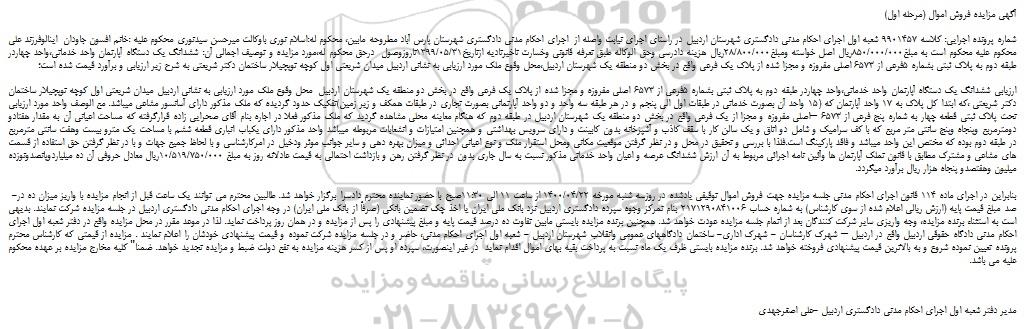شماره پرونده اجرایی: کلاسه 9901457 شعبه اول اجرای احکام مدنی دادگستری شهرستان اردبیل در راستای اجرای نیابت واصله از اجرای احکام مدنی دادگستری شهرستان پارس آباد مطروحه مابین، محکوم له:اسلام نوری باوکالت میرحسن سیدنوری محکوم علیه :خانم افسون جاودان اینالوفرزند علی محکوم علیه محکوم است به مبلغ850/000/000ریال اصل خواسته ومبلغ28/800/000ریال هزینه دادرسی وحق الوکاله طبق تعرفه قانونی وخسارت تاخیرتادیه ازتاریخ1399/05/31تاروزوصول درحق محکوم له،مورد مزایده و توصیف اجمالی آن: ششدانگ یک دستگاه آپارتمان واحد خدماتی،واحد چهاردر طبقه دوم به پلاک ثبتی بشماره 5فرعی از 6573 اصلی مفروزه و مجزا شده از پلاک یک فرعی واقع در بخش دو منطقه یک شهرستان اردبیل،محل وقوع ملک مورد ارزیابی به نشانی اردبیل میدان شریعتی اول کوچه توپچیلار ساختمان دکتر شریعتی به شرح زیر ارزیابی و برآورد قیمت شده است؛