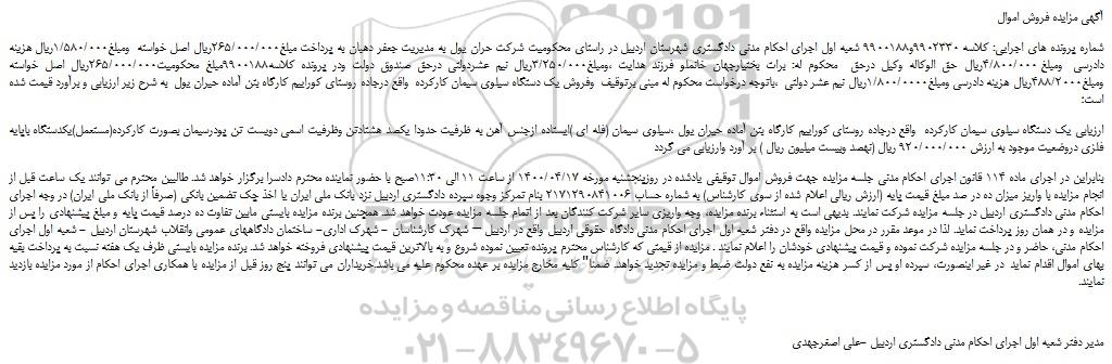 شماره پرونده های اجرایی: کلاسه 9902330و9900188 شعبه اول اجرای احکام مدنی دادگستری شهرستان اردبیل در راستای محکومیت شرکت حران یول به مدیریت جعفر دهبان به پرداخت مبلغ265/000/000ریال اصل خواسته ومبلغ1/580/000ریال هزینه دادرسی ومبلغ 4/800/000ریال حق الوکاله وکیل درحق محکوم له: برات بختیارجهان خانملو فرزند هدایت ،ومبلغ3/250/000ریال نیم عشردولتی درحق صندوق دولت ودر پرونده کلاسه9900188مبلغ محکومیت265/000/000ریال اصل خواسته ومبلغ488/2000ریال هزینه دادرسی ومبلغ1/800/0000ریال نیم عشر دولتی ،باتوجه درخواست محکوم له مبنی برتوقیف وفروش یک دستگاه سیلوی سیمان کارکرده واقع درجاده روستای کوراییم کارگاه بتن آماده حیران یول به شرح زیر ارزیابی و برآورد قیمت شده است؛
