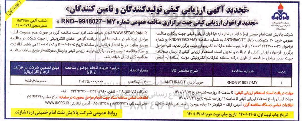 شرکت پالایش نفت امام خمینی (ره) شازند در نظر دارد فراخوان ارزیابی کیفی جهت برگزاری مناقصه عمومی خرید 30 متر مکعب ذغال ANTHRACITE به شماره مناقصه RND - 9918027- MY و شماره فراخوان2000092447000036 را از طریق سامانه تدارکات الکترونیکی دولت برگزار نماید. کلیه مراحل برگزاری فراخوان ارزیابی کیفی از دریافت و تحویل اسناد استعلام ارزیابی کیفی تا ارسال دعوتنامه جهت سایر مراحل مناقصه از طریق درگاه سامانه تدارکات الکترونیکی دولت ستاد به آدرس ستاد ایران انجام خواهد شد. لازم است مناقصه گران در صورت عدم عضویت قبلی مراحل ثبت نام در سایت مذکور و دریافت گواهی امضای الکترونیکی را جهت شرکت در مناقصه محقق سازند. تاریخ انتشار فراخوان در سامانه تاریخ 1400.4.5 و 1400.4.8 می باشد. اطلاعات و اسناد مناقصه عمومی پس از برگزاری فرآیند ارزیایبی کیفی و ارسال دعوتنامه از طریق سامانه ستاد به مناقصه گران ارسال خواهد شد.
