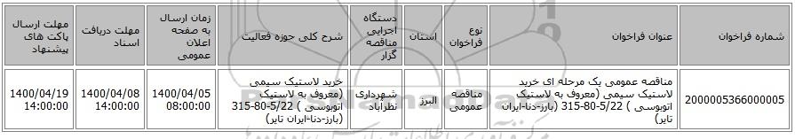 مناقصه، مناقصه عمومی یک مرحله ای خرید لاستیک سیمی (معروف به لاستیک اتوبوسی ) 5/22-80-315 (بارز-دنا-ایران تایر), مناقصه عمومی یک مرحله ای خرید لاستیک سیمی (معروف به لاستیک اتوبوسی ) 5/22-80-315 (بارز-دنا-ایران تایر)