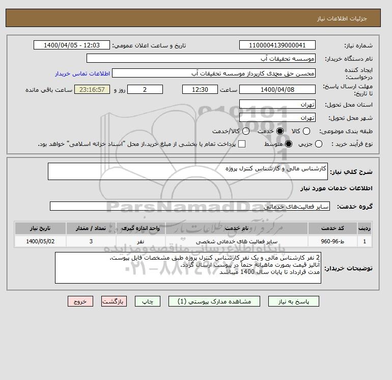 شرح کلی نیاز: کارشناس مالی و کارشناس کنترل پروژه