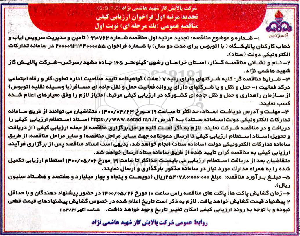 1- شماره و موضوع مناقصه: تجدید مرتبه اول مناقصه شماره 990762 (تامین و مدیریت سرویس ایاب و ذهاب کارکنان پالایشگاه با اتوبوس برای مدت دو سال) با شماره فراخوان 2000092134000055 در سامانه تدارکات الکترونیکی دولت ستاد