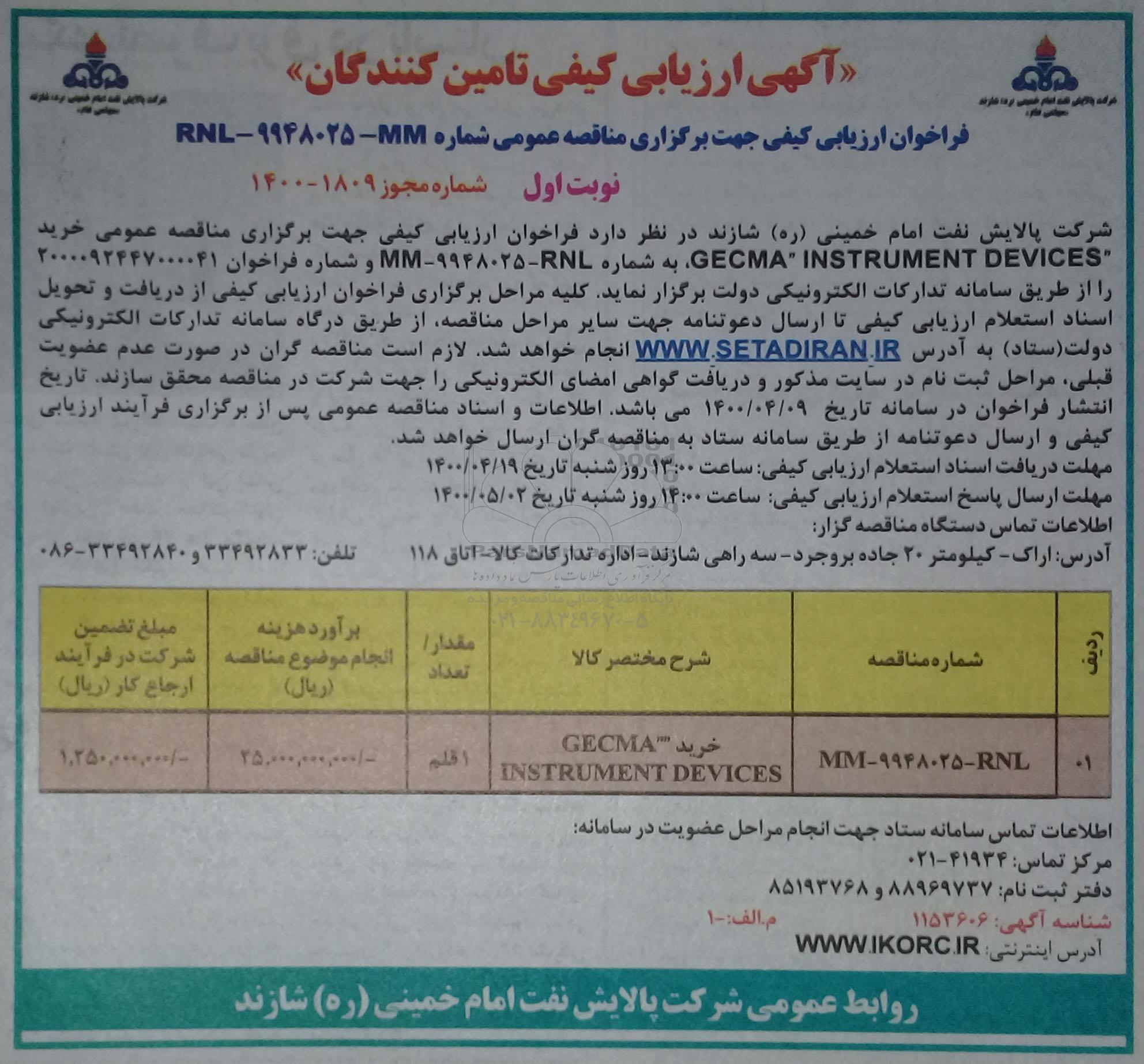شرکت پالایش نفت امام خمینی (ره) شازند در نظر دارد خرید GECMA INSTRUMENT DEVICES به شماره RNL - 9948025-MM و شماره فراخوان 2000092447000041 را از طریق سامانه تدارکات الکترونیکی دولت برگزار نماید. کلیه مراحل برگزاری فراخوان ارزیابی کیفی از دریافت و تحویل اسناد استعلام ارزیابی کیفی تا ارسال دعوتنامه جهت سایر مراحل مناقصه از طریق درگاه سامانه تدارکات الکترونیکی دولت ستاد انجام خواهد شد لازم است مناقصه گران در صورت عدم عضویت قبلی مراحل ثبت نام در سایت مذکور و دریافت گواهی امضای الکترونیکی را جهت شرکت در مناقصه محقق سازند . تاریخ انتشار فراخوان در سامانه تاریخ 1400.4.9 می باشد