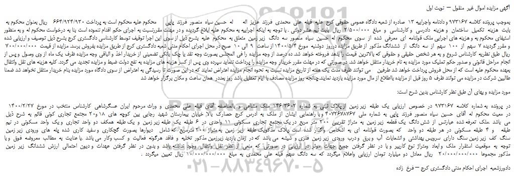 بموجب پرونده کلاسه 973167 و دادنامه واجراییه 13  صادره از شعبه دادگاه عمومی حقوقی کرج  علیه  قبله  علی  محمدی  فرزند  عزیز  اله      له  حسین سیاه  منصور  فرزند  پاپی      محکوم علیه محکوم است به پرداخت 664/924/930    ریال بعنوان محکوم به  بابت  هزینه  تکمیل  ساختمان  و هزینه  دادرسی  و کارشناسی  و  مبلغ  2/500/000  ریال  بابت نیم عشر دولتی . با توجه به اینکه اجراییه به محکوم علیه ابلاغ گردیده و در مهلت مقررنسبت به اجرای حکم اقدام ننموده است بنا به درخواست محکوم له و به منظور استیفای محکوم به و هزینه های اجرایی ملک قولنامه  ای  معرفی  شده  از  سوی  محکوم  له  حسین  سیاه  منصور  سه  دانگ  زیر زمین  متعلق به  محکوم  علیه  بشرح ذیل از سوی این اجرا توقیف توسط کارشناسی دادگستری کرج بشرح ذیل توصیف و ارزیابی شده و مقرر گردیده 7  سهم  از  100  سهم  از  سه  دانگ  از  ششدانگ مذکور  از طریق مزایده درروز  دوشنبه  مورخ 1400/5/4 از ساعت  9  الی 10  صبح در محل اجرای احکام مدنی شعبه دادگستری کرج از طریق مزایده بفروش برسد. مزایده از قیمت  700/000/000  ریال طبق نظریه کارشناس شروع و به هر شخص حقیقی و حقوقی که بالاترین قیمت را بدهد فروخته خواهد شد. ده درصد از وجه مزایده را فی المجلس بصورت وجه نقد یا چک بانکی تضمینی از خریدار اخذ و الباقی وجه مزایده ظرف یک ماه از وی وصول و پس از انجام مراحل قانونی و صدور حکم تملیک مورد مزایده به نام خریدار منتقل خواهد شد. در صورتی که در مهلت مقرر خریدار وجه مزایده را پرداخت ننماید سپرده وی پس از کسر هزینه های مزایده به نفع دولت ضبط و مزایده تجدید می گردد. کلیه هزینه های نقل وانتقال بعهده محکوم علیه است که از محل فروش پرداخت خواهد شد طرفین    می توانند ظرف مدت یک هفته از تاریخ مزایده نسبت به نحوه انجام مزایده اعتراض نمایند که در این صورت تا رسیدگی به اعتراض از سوی دادگاه مورد مزایده بنام خریدار منتقل نخواهد شد ضمنا طالبین شرکت در مزایده می توانند ظرف 5 روز قبل از مزایده بااطلاع از مال مورد مزایده بازدید نمایند.چنانجه روز مزایده مصادف با ایام تعطیل باشد روز بعددر  همان ساعت و مکان برگزار خواهد شد