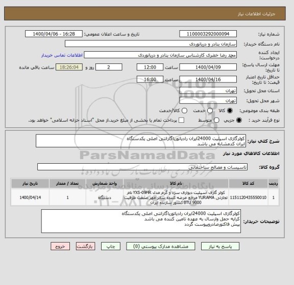 شرح کلی نیاز: کولرگازی اسپلیت 24000ایران رادیاتوریاگارانتی اصلی یکدستگاه