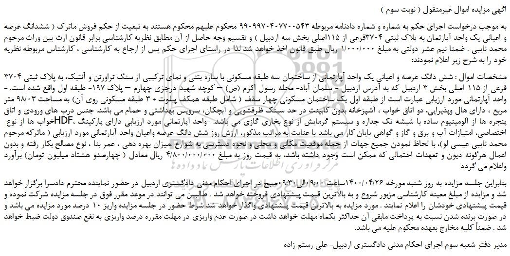 به موجب درخواست اجرای حکم به شماره و شماره دادنامه مربوطه 9909970407700543 محکوم علیهم محکوم هستند به تبعیت از حکم فروش ماترک ( ششدانگ عرصه و اعیانی یک واحد آپارتمان به پلاک ثبتی 3704فرعی از 115اصلی بخش سه اردبیل ) و تقسیم وجه حاصل از آن مطابق نظریه کارشناسی برابر قانون ارث بین وراث مرحوم محمد نایبی . ضمنا نیم عشر دولتی به مبلغ 1/000/000 ریال طبق قانون اخذ خواهد شد لذا در راستای اجرای حکم پس از ارجاع به کارشناسی ، کارشناس مربوطه نظریه خود را به شرح زیر اعلام نمودند: