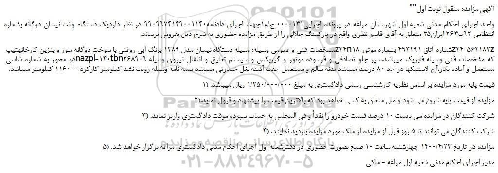 واحد اجرای احکام مدنی شعبه اول شهرستان مراغه در پرونده اجرایی0000131 ج/م1جهت اجرای دادنامه9909974149001140 در نظر داردیک دستگاه وانت نیسان دوگانه بشماره انتظامی 92ب263 ایران35 متعلق به آقای قاسم نظری واقع در پارکینگ جلالی را از طریق مزایده حضوری به شرح ذیل بفروش برساند.