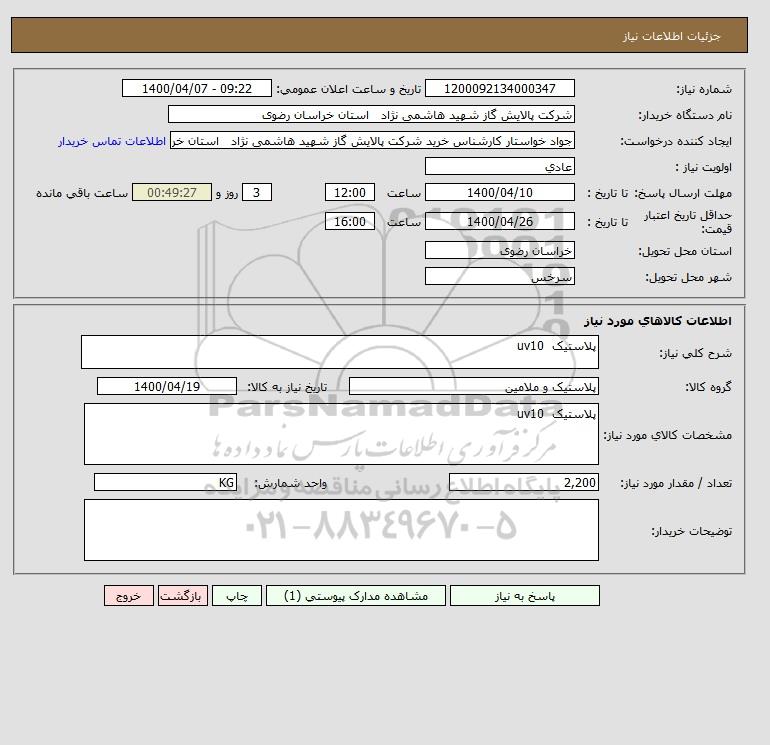 نام دستگاه خریدار:شرکت پالایش گاز شهید هاشمی نژاد استان خراسان رضوی