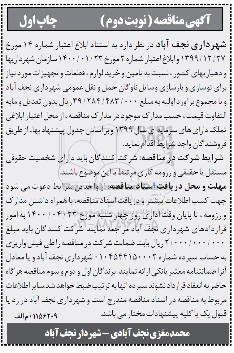 شهرداری نجف آباد در نظر دارد به استناد ابلاغ اعتبار شماره 14 1399.12.27 و ابلاغ اعتبار شماره 2 مورخ 1400.1.23 سازمان شهرداری ها و دهیاری های کشور ، نسبت به تامین و خرید لوازم، قطعات و تجهیزات مورد نیاز برای نوسازی و بازسازی وسایل ناوگان حمل و نقل عمومی شهرداری نجف آباد و با مجموع برآورد اولیه به مبلغ 39.284.483.000 ریال بدون تعدیل و مابه تفاوت قیمت حذف مدارک مورد موجود در مدارک مناقصه از محل اعتبار ابلاغی تملک دارایی‌های سرمایه‌ای سال ۹۹ و بر اساس جدول پیشنهاد بهار از طریق فروشندگان واجد شرایط اقدام نمایند