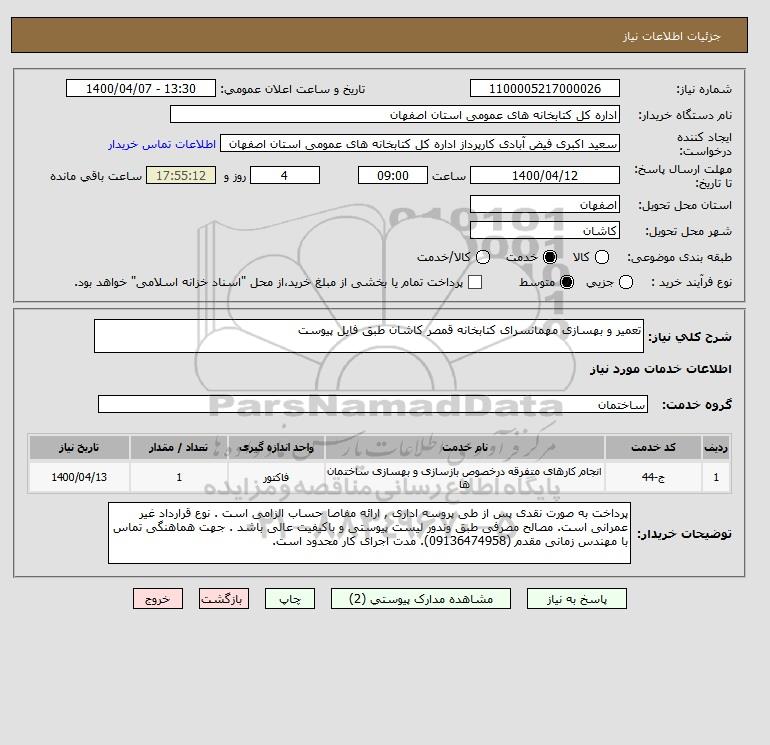 شرح کلی نیاز: تعمیر و بهسازی مهمانسرای کتابخانه قمصر کاشان طبق فایل پیوست