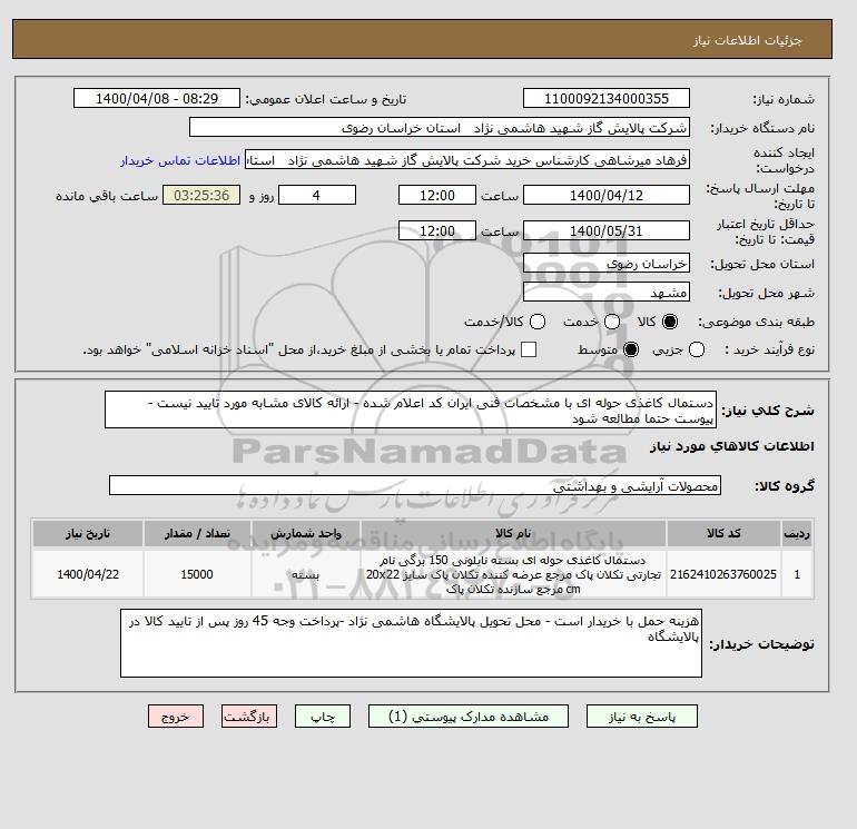 نام دستگاه خریدار:شرکت پالایش گاز شهید هاشمی نژاد استان خراسان رضوی