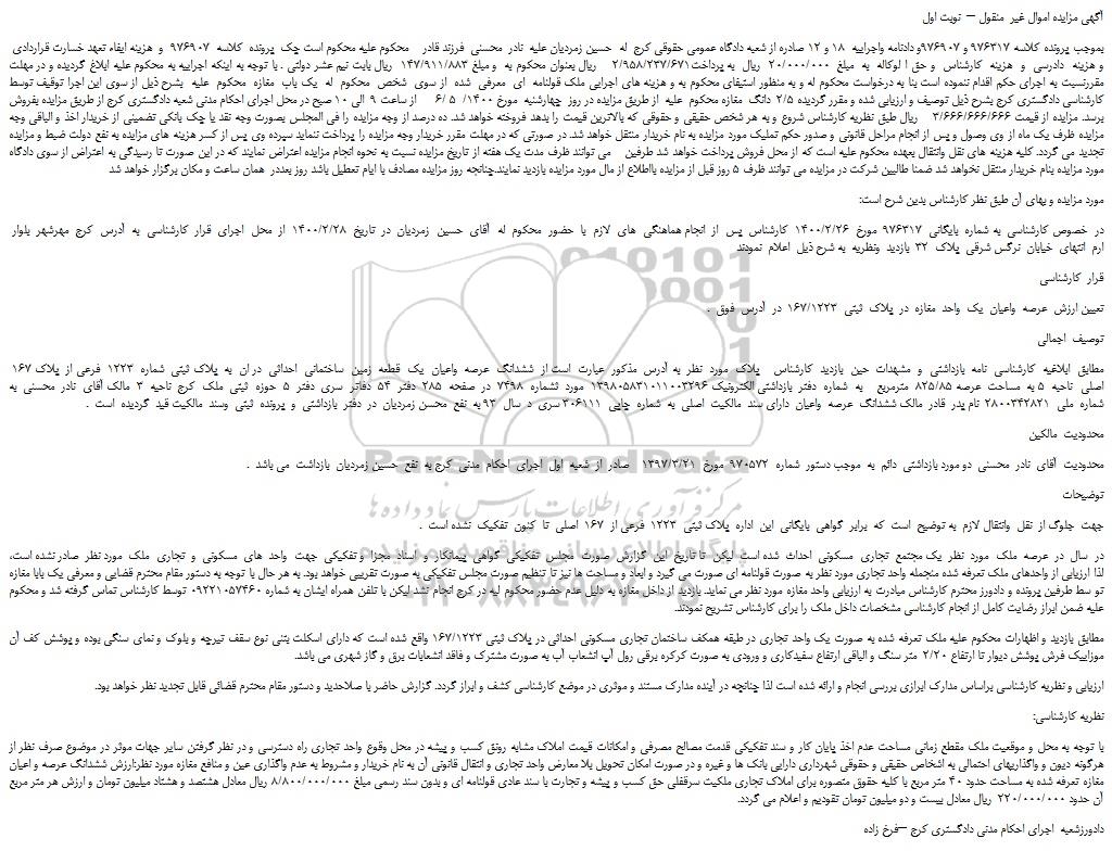 بموجب پرونده کلاسه 976317 و 976907و دادنامه واجراییه 18 و 12 صادره از شعبه دادگاه عمومی حقوقی کرج له حسین زمردیان علیه نادر محسنی فرزند قادر محکوم علیه محکوم است چک پرونده کلاسه 976907 و هزینه ایفاء تعهد خسارت قراردادی و هزینه دادرسی و هزینه کارشناس و حق ا لوکاله به مبلغ 20/000/000 ریال به پرداخت2/958/237/671 ریال بعنوان محکوم به و مبلغ 147/911/883 ریال بابت نیم عشر دولتی . با توجه به اینکه اجراییه به محکوم علیه ابلاغ گردیده و در مهلت مقررنسبت به اجرای حکم اقدام ننموده است بنا به درخواست محکوم له و به منظور استیفای محکوم به و هزینه های اجرایی ملک قولنامه ای معرفی شده از سوی شخص محکوم له یک باب مغازه محکوم علیه بشرح ذیل از سوی این اجرا توقیف توسط کارشناسی دادگستری کرج بشرح ذیل توصیف و ارزیابی شده و مقرر گردیده 2/5 دانگ مغازه محکوم علیه از طریق مزایده در روز چهارشنبه مورخ 1400/ 5 /6 از ساعت 9 الی 10 صبح در محل اجرای احکام مدنی شعبه دادگستری کرج از طریق مزایده بفروش برسد. مزایده از قیمت 3/666/666/666 ریال طبق نظریه کارشناس شروع و به هر شخص حقیقی و حقوقی که بالاترین قیمت را بدهد فروخته خواهد شد. ده درصد از وجه مزایده را فی المجلس بصورت وجه نقد یا چک بانکی تضمینی از خریدار اخذ و الباقی وجه مزایده ظرف یک ماه از وی وصول و پس از انجام مراحل قانونی و صدور حکم تملیک مورد مزایده به نام خریدار منتقل خواهد شد. در صورتی که در مهلت مقرر خریدار وجه مزایده را پرداخت ننماید سپرده وی پس از کسر هزینه های مزایده به نفع دولت ضبط و مزایده تجدید می گردد. کلیه هزینه های نقل وانتقال بعهده محکوم علیه است که از محل فروش پرداخت خواهد شد طرفین می توانند ظرف مدت یک هفته از تاریخ مزایده نسبت به نحوه انجام مزایده اعتراض نمایند که در این صورت تا رسیدگی به اعتراض از سوی دادگاه مورد مزایده بنام خریدار منتقل نخواهد شد ضمنا طالبین شرکت در مزایده می توانند ظرف 5 روز قبل از مزایده بااطلاع از مال مورد مزایده بازدید نمایند.چنانجه روز مزایده مصادف با ایام تعطیل باشد روز بعددر همان ساعت و مکان برگزار خواهد شد
