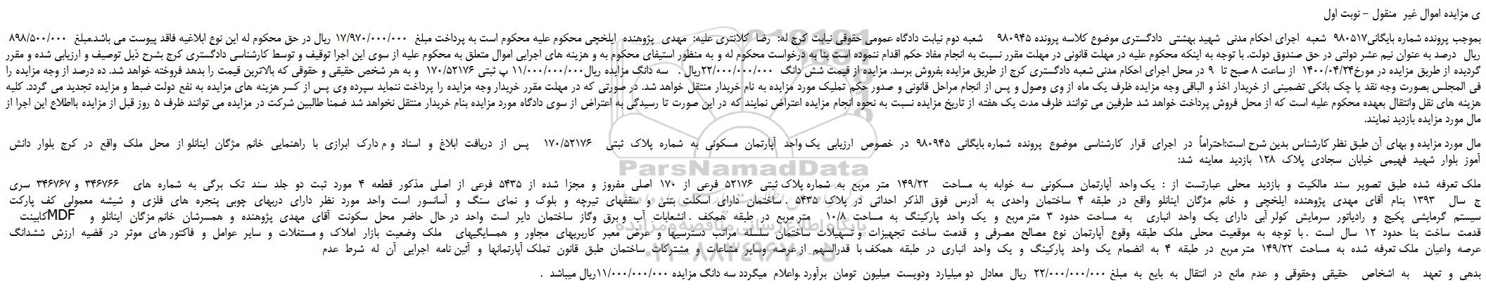 بموجب پرونده شماره بایگانی980517 شعبه اجرای احکام مدنی شهید بهشتی دادگستری موضوع کلاسه پرونده 980945 شعبه دوم نیابت دادگاه عمومی حقوقی نیابت کرج له: رضا کلانتری علیه: مهدی پژوهنده ایلخچی محکوم علیه محکوم است به پرداخت مبلغ 17/970/000/000 ریال در حق محکوم له این نوع ابلاغیه فاقد پیوست می باشد.مبلغ 898/500/000 ریال درصد به عنوان نیم عشر دولتی در حق صندوق دولت. با توجه به اینکه محکوم علیه در مهلت قانونی در مهلت مقرر نسبت به انجام مفاد حکم اقدام ننموده است بنا به درخواست محکوم له و به منظور استیفای محکوم به و هزینه های اجرایی اموال متعلق به محکوم علیه از سوی این اجرا توقیف و توسط کارشناسی دادگستری کرج بشرح ذیل توصیف و ارزیابی شده و مقرر گردیده از طریق مزایده در مورخ1400/04/24 از ساعت 8 صبح تا 9 در محل اجرای احکام مدنی شعبه دادگستری کرج از طریق مزایده بفروش برسد. مزایده از قیمت شش دانگ 22/000/000/000ریال . سه دانگ مزایده ریال11/000/000/000 پ ثبتی 170/52176 و به هر شخص حقیقی و حقوقی که بالاترین قیمت را بدهد فروخته خواهد شد. ده درصد از وجه مزایده را فی المجلس بصورت وجه نقد یا چک بانکی تضمینی از خریدار اخذ و الباقی وجه مزایده ظرف یک ماه از وی وصول و پس از انجام مراحل قانونی و صدور حکم تملیک مورد مزایده به نام خریدار منتقل خواهد شد. در صورتی که در مهلت مقرر خریدار وجه مزایده را پرداخت ننماید سپرده وی پس از کسر هزینه های مزایده به نفع دولت ضبط و مزایده تجدید می گردد. کلیه هزینه های نقل وانتقال بعهده محکوم علیه است که از محل فروش پرداخت خواهد شد طرفین می توانند ظرف مدت یک هفته از تاریخ مزایده نسبت به نحوه انجام مزایده اعتراض نمایند که در این صورت تا رسیدگی به اعتراض از سوی دادگاه مورد مزایده بنام خریدار منتقل نخواهد شد ضمنا طالبین شرکت در مزایده می توانند ظرف 5 روز قبل از مزایده بااطلاع این اجرا از مال مورد مزایده بازدید نمایند.