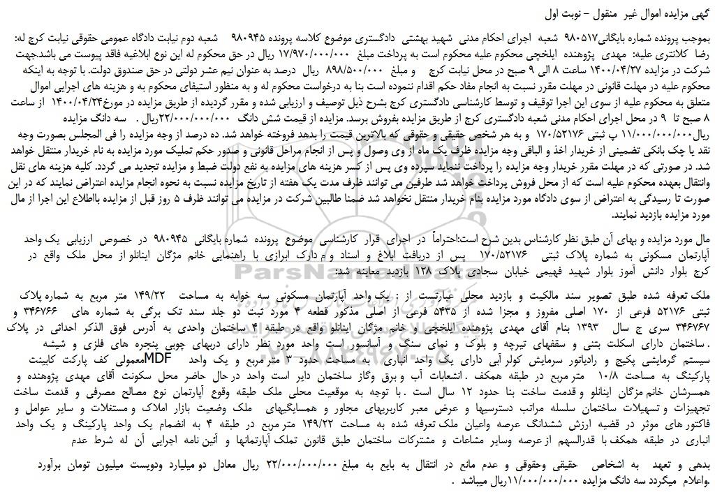 مال مورد مزایده و بهای آن طبق نظر کارشناس بدین شرح است:احتراماً در اجرای قرار کارشناسی موضوع پرونده شماره بایگانی 980945 در خصوص ارزیابی یک واحد آپارتمان مسکونی به شماره پلاک ثبتی 170/52176 پس از دریافت ابلاغ و اسناد و م دارک ابرازی با راهنمایی خانم مژگان اینانلو از محل ملک واقع در کرج بلوار دانش آموز بلوار شهید فهیمی خیابان سجادی پلاک 128 بازدید معاینه شد: