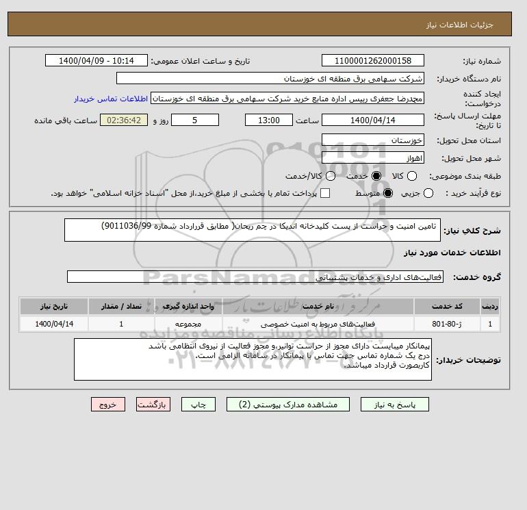 شرح کلی نیاز: تامین امنیت و حراست از پست کلیدخانه اندیکا در چم ریحان( مطابق قررارداد شماره 9011036/99)