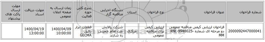 | 2000092447000041 | فراخوان ارزیابی کیفی مناقصه عمومی دو مرحله ای شماره RNL-9948025-MM | ارزیابی کیفی برای مناقصه عمومی | مرکزی | شرکت پالایش نفت امام خمینی ره شازند | فطعات ابزار دقیق GECMA | 1400/04/09 10:00:00 | 1400/04/19 13:00:00 |