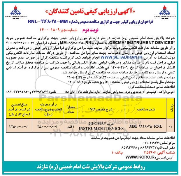 | RNL - 9948025-MM | خرید GECMA INSTRUMENT DEVICES | 1 قلم | 25.000.000.000 | 1.250.000.000 |