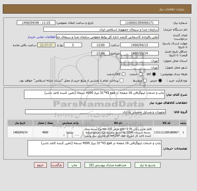 شرح کلی نیاز: چاپ و خدمات لیتوگرافی 16 صفحه در قطع 43*31 تیراژ 4000 نسخه (تامین کننده کاغذ ناشر)
