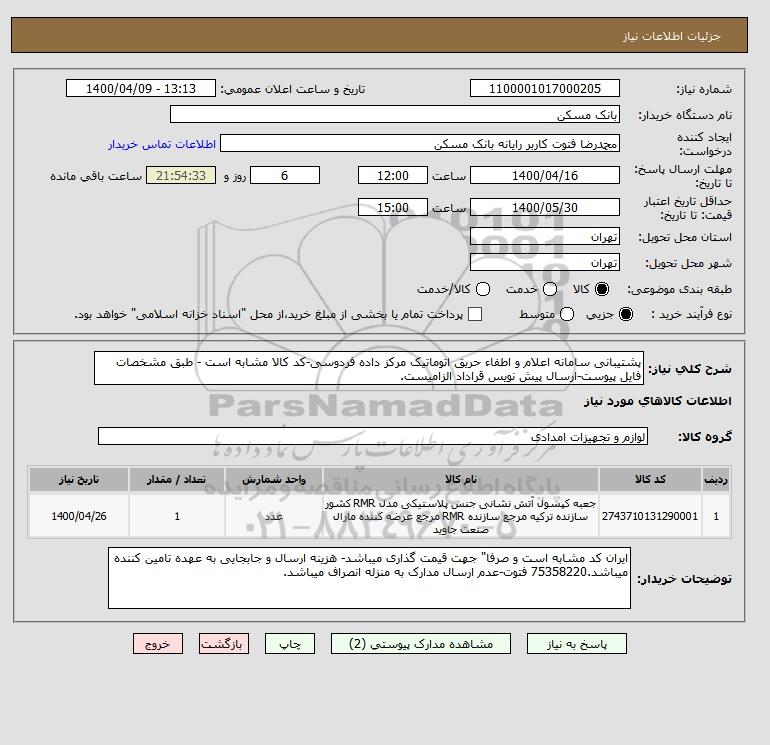 شرح کلی نیاز: پشتیبانی سامانه اعلام و اطفاء حریق اتوماتیک مرکز داده فردوسی-کد کالا مشابه است - طبق مشخصات فایل پیوست-ارسال پیش نویس قراداد الزامیست.