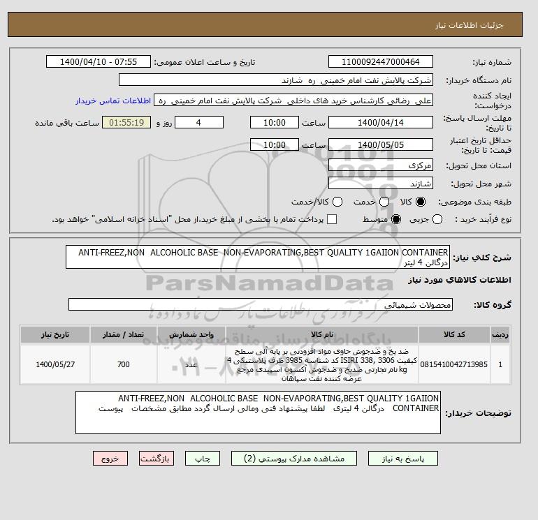 شرح کلی نیاز: ANTI-FREEZ,NON ALCOHOLIC BASE NON-EVAPORATING,BEST QUALITY 1GAIION CONTAINER درگالن 4 لیتر