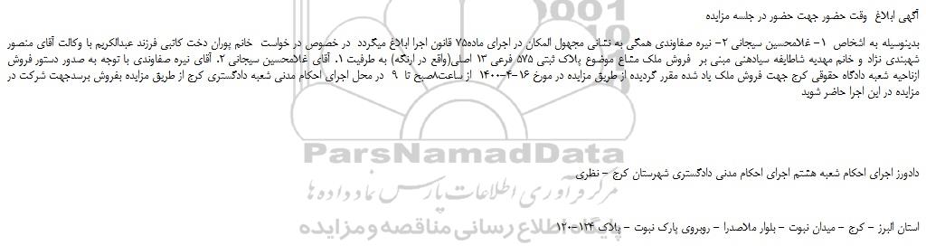 بدینوسیله به اشخاص 1- غلامحسین سیجانی 2- نیره صفاوندی همگی به نشانی مجهول المکان در اجرای ماده75 قانون اجرا ابلاغ میگردد در خصوص در خواست خانم پوران دخت کاتبی فرزند عبدالکریم با وکالت آقای منصور شهبندی نژاد و خانم مهدیه شاطایفه سیادهنی مبنی بر فروش ملک مشاع موضوع پلاک ثبتی 575 فرعی 13 اصلی(واقع در ارنگه) به طرفیت 1. آقای غلامحسین سیجانی 2. آقای نیره صفاوندی با توجه به صدور دستور فروش ازناحیه شعبه دادگاه حقوقی کرج جهت فروش ملک یاد شده مقرر گردیده از طریق مزایده در مورخ 16-4-1400 از ساعت8صبح تا 9 در محل اجرای احکام مدنی شعبه دادگستری کرج از طریق مزایده بفروش برسدجهت شرکت در مزایده در این اجرا حاضر شوید