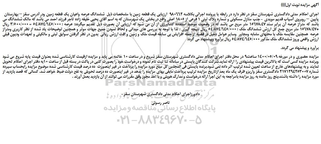 اجرای احکام مدنی دادگستری شهرستان سقز در نظر دارد در رابطه با پرونده اجرائی بکلاسه 980662  ارزیابی یک قطعه زمین با مشخصات ذیل  ششدانگ عرصه واعیان یک قطعه زمین ودر آدرس سقز – بهارستان پایین – روبروی آسیاب قدیم مویدی - جنب منازل مسکونی و شماره پلاک ثبتی 1 فرعی از 1805 اصلی واقع در بخش یک شهرستان که به اسم آقای یحیی خلیفه زاده تاجر فرزند احمد می باشد که مالک ششدانگ می باشد که متراژ عرصه آن برابر سند 15678.47 متر مربع می باشد که در وضعیت موجود استفاده کشاورزی از آن می شود که ارزیابی آن بصورت ذیل تقدیم میگردد: عرصه : 54/874/645/000 = 3/500/000 ریال *15678/47 متر مربع جمع کل ارزش ششدانگ ملک : 54/874/645/000 ریال نتیجه گیری : لذا با توجه به بررسی های میدانی و لحاظ نمودن جمیع جهات موثر و همچنین توضیحات یاد شده از نظر کاربری ومتراژ عرصه  همچنین مقایسه ملک با محلهای مشابه ومجاور  وسایر عوامل دخیل در قضیه از جمله افزایش بی سابقه قیمت ملک و زمین و افت ارزش ریالی  بدون در نظر گرفتن سوابق ثبتی و مالکیتی و تعهدات ودیون قبلی ارزش واقعی وروز ششدانگ ملک مذکور 54/874/645/000 ریال برآورد وپیشنهاد می گردد