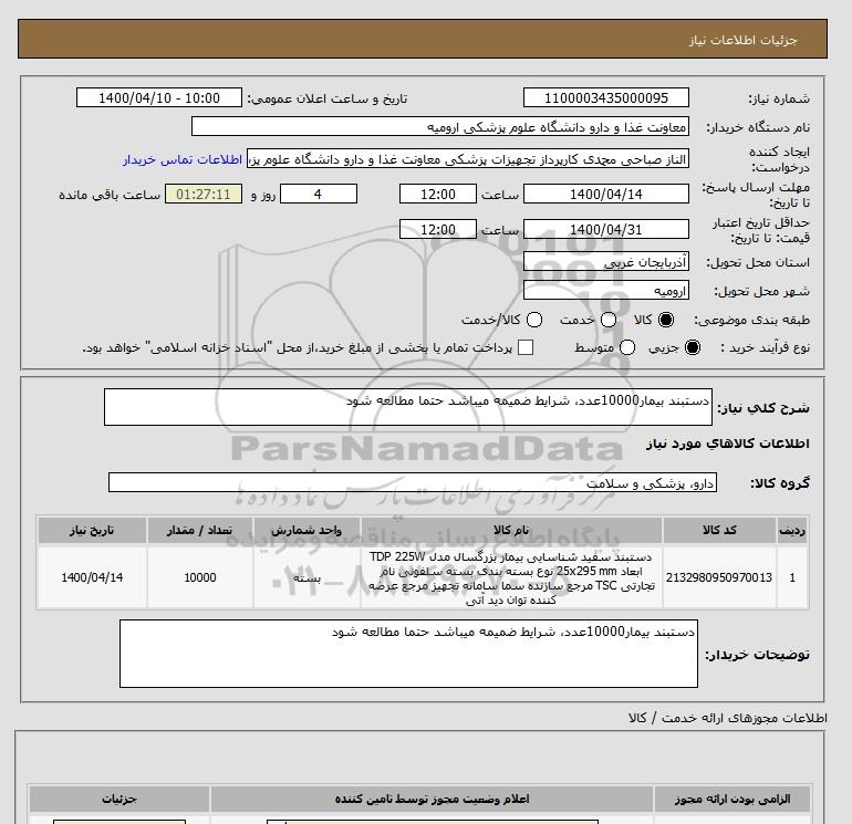 شرح کلی نیاز: دستبند بیمار10000عدد، شرایط ضمیمه میباشد حتما مطالعه شود
