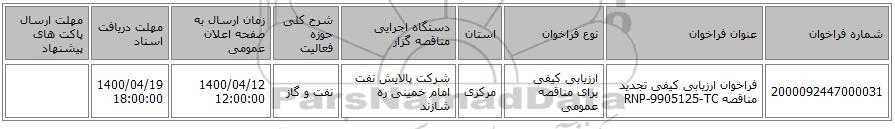مناقصه، فراخوان ارزیابی کیفی تجدید مناقصه RNP-9905125-TC, فراخوان ارزیابی کیفی تجدید مناقصه RNP-9905125-TC