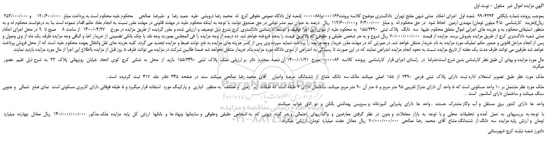 بموجب پرونده شماره بایگانی  9904293  شعبه اول  اجرای احکام  مدنی شهی مفتح تهران  دادگستری موضوع کلاسه پرونده0000166و(0000088 )شعبه اول دادگاه عمومی حقوقی کرج  له  محمد رضا درویشی  علیه  حمید رضا  و  علیرضا  صالحی    محکوم علیه محکوم است به پرداخت مبلغ  120/600/000    و 252/000/000  ریال)(هزینه  کارشناسی  6/5 میلون تومان) مهندی ارمین  لحاظ شود  در حق محکوم له  و مبلغ  6/300/000  و112/600/000 ریال  درصد به عنوان نیم عشر دولتی در حق صندوق دولت. با توجه به اینکه محکوم علیه در مهلت قانونی در مهلت مقرر نسبت به انجام مفاد حکم اقدام ننموده است بنا به درخواست محکوم له و به منظور استیفای محکوم به و هزینه های اجرایی اموال متعلق محکوم علیها  سه  دانگ  پلاک ثبتی  155/2490  به محکوم علیه از سوی این اجرا توقیف و توسط کارشناسی دادگستری کرج بشرح ذیل توصیف و ارزیابی شده و مقرر گردیده از طریق مزایده در مورخ    1400/04/27  از ساعت 8    صبح تا  9 در محل اجرای احکام مدنی شعبه دادگستری کرج از طریق مزایده بفروش برسد. مزایده از قیمت  70/000/000/000 ریال شروع و به هر شخص حقیقی و حقوقی که بالاترین قیمت را بدهد فروخته خواهد شد. ده درصد از وجه مزایده را فی المجلس بصورت وجه نقد یا چک بانکی تضمینی از خریدار اخذ و الباقی وجه مزایده ظرف یک ماه از وی وصول و پس از انجام مراحل قانونی و صدور حکم تملیک مورد مزایده به نام خریدار منتقل خواهد شد. در صورتی که در مهلت مقرر خریدار وجه مزایده را پرداخت ننماید سپرده وی پس از کسر هزینه های مزایده به نفع دولت ضبط و مزایده تجدید می گردد. کلیه هزینه های نقل وانتقال بعهده محکوم علیه است که از محل فروش پرداخت خواهد شد طرفین می توانند ظرف مدت یک هفته از تاریخ مزایده نسبت به نحوه انجام مزایده اعتراض نمایند که در این صورت تا رسیدگی به اعتراض از سوی دادگاه مورد مزایده بنام خریدار منتقل نخواهد شد ضمنا طالبین شرکت در مزایده می توانند ظرف 5 روز قبل از مزایده بااطلاع این اجرا از مال مورد مزایده بازدید نمایند.