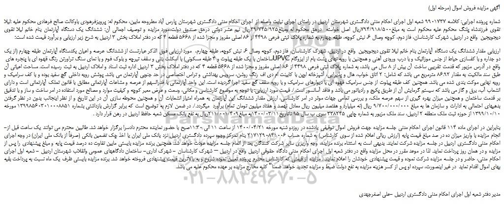 شماره پرونده اجرایی: کلاسه 9901737 شعبه اول اجرای احکام مدنی دادگستری شهرستان اردبیل در راستای اجرای نیابت واصله از اجرای احکام مدنی دادگستری شهرستان پارس آباد مطروحه مابین، محکوم له: پرویزفرهودی باوکالت صالح فرهادی محکوم علیه :لیلا تقوی فرزندشاه پلنگ محکوم علیه محکوم است به مبلغ794/918/500ریال اصل خواسته درحق محکوم له ومبلغ39/745/925ریال نیم عشر دولتی درحق صندوق دولت،مورد مزایده و توصیف اجمالی آن: ششدانگ یک دستگاه آپارتمان بنام خانم لیلا تقوی دیجویجین واقع در اردبیل، شهرک کارشناسان، فاز دوم، کوچه وصال 6، نبش کوچه، طبقه چهارم،به شماره پلاک ثبتی فرعی 4498 از 86 اصلی مفروز و مجزا شده از 5668 قطعه 4 که در دفتر املاک بخش 3 اردبیل به شرح زیر ارزیابی و برآورد قیمت شده است؛
