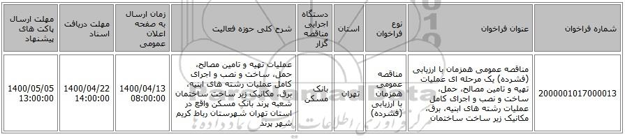 2000001017000013 | مناقصه عمومی همزمان با ارزیابی (فشرده) یک مرحله ای عملیات تهیه و تامین مصالح، حمل، ساخت و نصب و اجرای کامل عملیات رشته های ابنیه، برق، مکانیک زیر ساخت ساختمان | مناقصه عمومی همزمان با ارزیابی (فشرده) | تهران | بانک مسکن | عملیات تهیه و تامین مصالح، حمل، ساخت و نصب و اجرای کامل عملیات رشته های ابنیه، برق، مکانیک زیر ساخت ساختمان شعبه پرند بانک مسکن واقع در استان تهران شهرستان رباط کریم شهر پرند | 1400/04/13 08:00:00 | 1400/04/22 14:00:00 | 1400/05/05 13:00:00 |