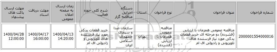 | 2000001554000016 | مناقصه عمومی همزمان با ارزیابی (فشرده) دو مرحله ای خرید قطعات یدکی مورد نیاز فرستنده های تلویزیونی و رادیوئی اف ام | مناقصه عمومی همزمان با ارزیابی (فشرده) | تهران | سازمان صدا و سیمای جمهوری اسلامی ایران | خرید قطعات یدکی مورد نیاز فرستنده های تلویزیونی و رادیوئی اف ام | 1400/04/13 14:20:00 | 1400/04/17 16:00:00 | 1400/04/28 12:00:00 |