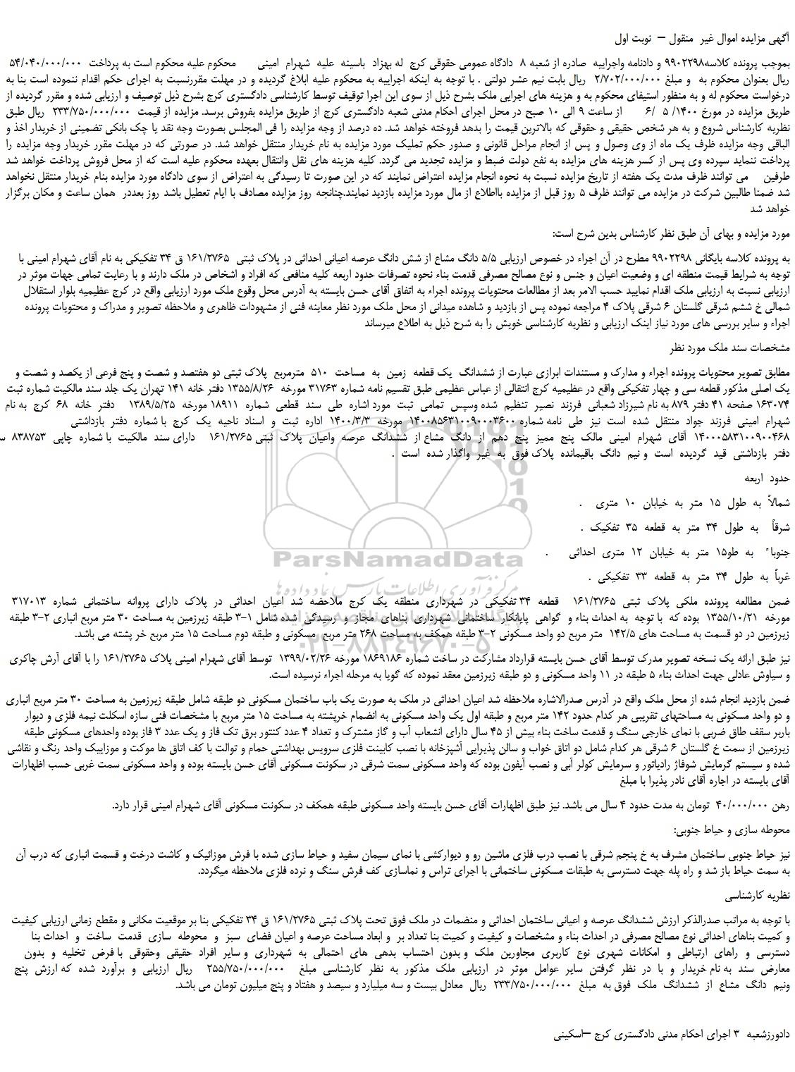 بموجب پرونده کلاسه9902298 و دادنامه واجراییه صادره از شعبه 8 دادگاه عمومی حقوقی کرج له بهزاد باسینه علیه شهرام امینی محکوم علیه محکوم است به پرداخت 54/040/000/000 ریال بعنوان محکوم به و مبلغ 2/702/000/000 ریال بابت نیم عشر دولتی . با توجه به اینکه اجراییه به محکوم علیه ابلاغ گردیده و در مهلت مقررنسبت به اجرای حکم اقدام ننموده است بنا به درخواست محکوم له و به منظور استیفای محکوم به و هزینه های اجرایی ملک بشرح ذیل از سوی این اجرا توقیف توسط کارشناسی دادگستری کرج بشرح ذیل توصیف و ارزیابی شده و مقرر گردیده از طریق مزایده در مورخ 1400/ 5 /6 از ساعت 9 الی 10 صبح در محل اجرای احکام مدنی شعبه دادگستری کرج از طریق مزایده بفروش برسد. مزایده از قیمت 233/750/000/000 ریال طبق نظریه کارشناس شروع و به هر شخص حقیقی و حقوقی که بالاترین قیمت را بدهد فروخته خواهد شد. ده درصد از وجه مزایده را فی المجلس بصورت وجه نقد یا چک بانکی تضمینی از خریدار اخذ و الباقی وجه مزایده ظرف یک ماه از وی وصول و پس از انجام مراحل قانونی و صدور حکم تملیک مورد مزایده به نام خریدار منتقل خواهد شد. در صورتی که در مهلت مقرر خریدار وجه مزایده را پرداخت ننماید سپرده وی پس از کسر هزینه های مزایده به نفع دولت ضبط و مزایده تجدید می گردد. کلیه هزینه های نقل وانتقال بعهده محکوم علیه است که از محل فروش پرداخت خواهد شد طرفین می توانند ظرف مدت یک هفته از تاریخ مزایده نسبت به نحوه انجام مزایده اعتراض نمایند که در این صورت تا رسیدگی به اعتراض از سوی دادگاه مورد مزایده بنام خریدار منتقل نخواهد شد ضمنا طالبین شرکت در مزایده می توانند ظرف 5 روز قبل از مزایده بااطلاع از مال مورد مزایده بازدید نمایند.چنانجه روز مزایده مصادف با ایام تعطیل باشد روز بعددر همان ساعت و مکان برگزار خواهد شد