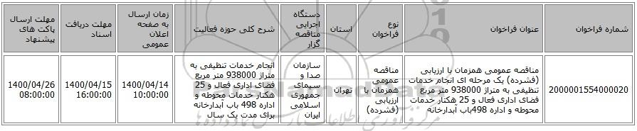 | 2000001554000020 | مناقصه عمومی همزمان با ارزیابی (فشرده) یک مرحله ای انجام خدمات تنظیفی به متراژ 938000 متر مربع فضای اداری فعال و 25 هکتار خدمات محوطه و اداره 498باب آبدارخانه | مناقصه عمومی همزمان با ارزیابی (فشرده) | تهران | سازمان صدا و سیمای جمهوری اسلامی ایران | انجام خدمات تنظیفی به متراژ 938000 متر مربع فضای اداری فعال و 25 هکتار خدمات محوطه و اداره 498 باب آبدارخانه برای مدت یک سال | 1400/04/14 10:00:00 | 1400/04/15 16:00:00 | 1400/04/26 08:00:00 |