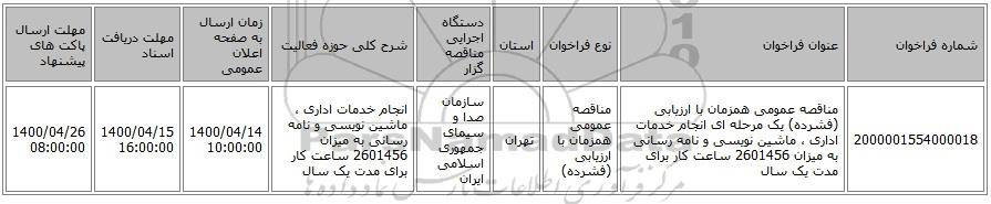 | 2000001554000018 | مناقصه عمومی همزمان با ارزیابی (فشرده) یک مرحله ای انجام خدمات اداری ، ماشین نویسی و نامه رسانی به میزان 2601456 ساعت کار برای مدت یک سال | مناقصه عمومی همزمان با ارزیابی (فشرده) | تهران | سازمان صدا و سیمای جمهوری اسلامی ایران | انجام خدمات اداری ، ماشین نویسی و نامه رسانی به میزان 2601456 ساعت کار برای مدت یک سال | 1400/04/14 10:00:00 | 1400/04/15 16:00:00 | 1400/04/26 08:00:00 |