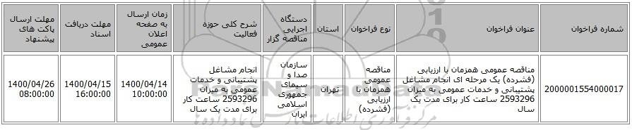 | 2000001554000017 | مناقصه عمومی همزمان با ارزیابی (فشرده) یک مرحله ای انجام مشاغل پشتیبانی و خدمات عمومی به میزان 2593296 ساعت کار برای مدت یک سال | مناقصه عمومی همزمان با ارزیابی (فشرده) | تهران | سازمان صدا و سیمای جمهوری اسلامی ایران | انجام مشاغل پشتیبانی و خدمات عمومی به میزان 2593296 ساعت کار برای مدت یک سال | 1400/04/14 10:00:00 | 1400/04/15 16:00:00 | 1400/04/26 08:00:00 |