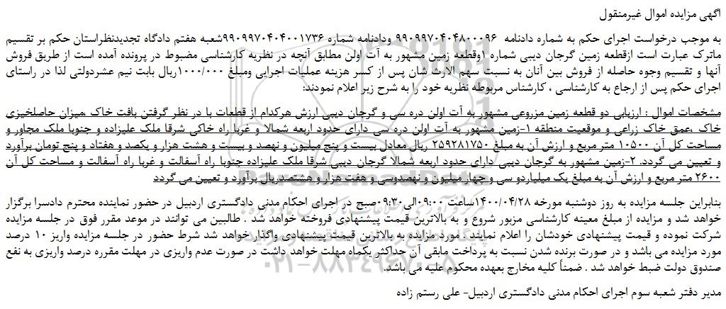 مشخصات اموال : ارزیابی دو قطعه زمین مزروعی مشهور به آت اولن دره سی و گرجان دیبی ارزش هرکدام از قطعات با در نظر گرفتن بافت خاک ،میزان حاصلخیزی خاک ،عمق خاک زراعی و موقعیت منطقه 1-زمین مشهور به آت اولن دره سی دارای حدود اربعه شمالا و غربا راه خاکی شرقا ملک علیزاده و جنوبا ملک مجاور و مساحت کل آن 10500 متر مربع و ارزش آن به مبلغ 259281750 ریال معادل بیست و پنج میلیون و نهصد و بیست و هشت هزار و یکصد و هفتاد و پنج تومان برآورد و تعیین می گردد. 2-زمین مشهور به گرجان دیبی دارای حدود اربعه شمالا گرجان دیبی شرقا ملک علیزاده جنوبا راه آسفالت و غربا راه آسفالت و مساحت کل آن 2600 متر مربع و ارزش آن به مبلغ یک میلیاردو سی و چهار میلیون و نهصدوسی و هفت هزار و هشتصدریال برآورد و تعیین می گردد