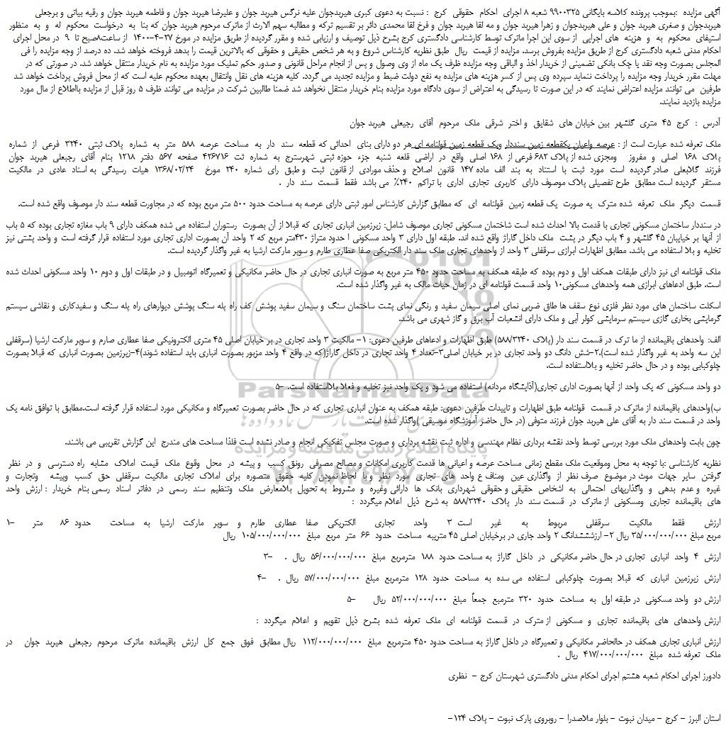 آگهی مزایده :بموجب پرونده کلاسه بایگانی 9900325 شعبه 8 اجرای احکام حقوقی کرج : نسبت به دعوی کبری هیربدجوان علیه نرگس هیربد جوان و علیرضا هیربد جوان و فاطمه هیربد جوان و رقیه بیاتی و برجعلی هیربدجوان و صغری هیربد جوان و علی هیربدجوان و زهرا هیربد جوان و مه لقا هیربد جوان و فرخ لقا محمدی دائر بر تقسیم ترکه و مطالبه سهم الارث از ماترک مرحوم هیربد جوان که بنا به درخواست محکوم له و به منظور استیفای محکوم به و هزینه های اجرایی از سوی این اجرا ماترک توسط کارشناسی دادگستری کرج بشرح ذیل توصیف و ارزیابی شده و مقرر گردیده از طریق مزایده در مورخ 27-4-1400 از ساعت8صبح تا 9 در محل اجرای احکام مدنی شعبه دادگستری کرج از طریق مزایده بفروش برسد. مزایده از قیمت ریال طبق نظریه کارشناس شروع و به هر شخص حقیقی و حقوقی که بالاترین قیمت را بدهد فروخته خواهد شد. ده درصد از وجه مزایده را فی المجلس بصورت وجه نقد یا چک بانکی تضمینی از خریدار اخذ و الباقی وجه مزایده ظرف یک ماه از وی وصول و پس از انجام مراحل قانونی و صدور حکم تملیک مورد مزایده به نام خریدار منتقل خواهد شد. در صورتی که در مهلت مقرر خریدار وجه مزایده را پرداخت ننماید سپرده وی پس از کسر هزینه های مزایده به نفع دولت ضبط و مزایده تجدید می گردد. کلیه هزینه های نقل وانتقال بعهده محکوم علیه است که از محل فروش پرداخت خواهد شد طرفین می توانند مزایده اعتراض نمایند که در این صورت تا رسیدگی به اعتراض از سوی دادگاه مورد مزایده بنام خریدار منتقل نخواهد شد ضمنا طالبین شرکت در مزایده می توانند ظرف 5 روز قبل از مزایده بااطلاع از مال مورد مزایده بازدید نمایند.