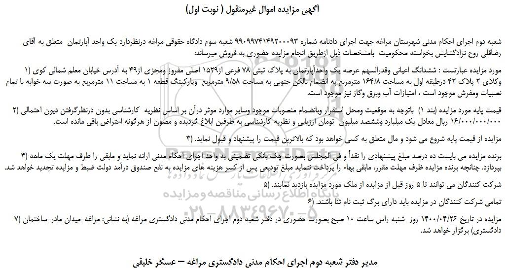 شعبه دوم اجرای احکام مدنی شهرستان مراغه جهت اجرای دادنامه شماره 9909974149200093 شعبه سوم دادگاه حقوقی مراغه درنظردارد یک واحد آپارتمان متعلق به آقای رضاقلی روح نژادگشایش بخواسته محکومیت بامشخصات ذیل ازطریق انجام مزایده حضوری به فروش میرساند:
