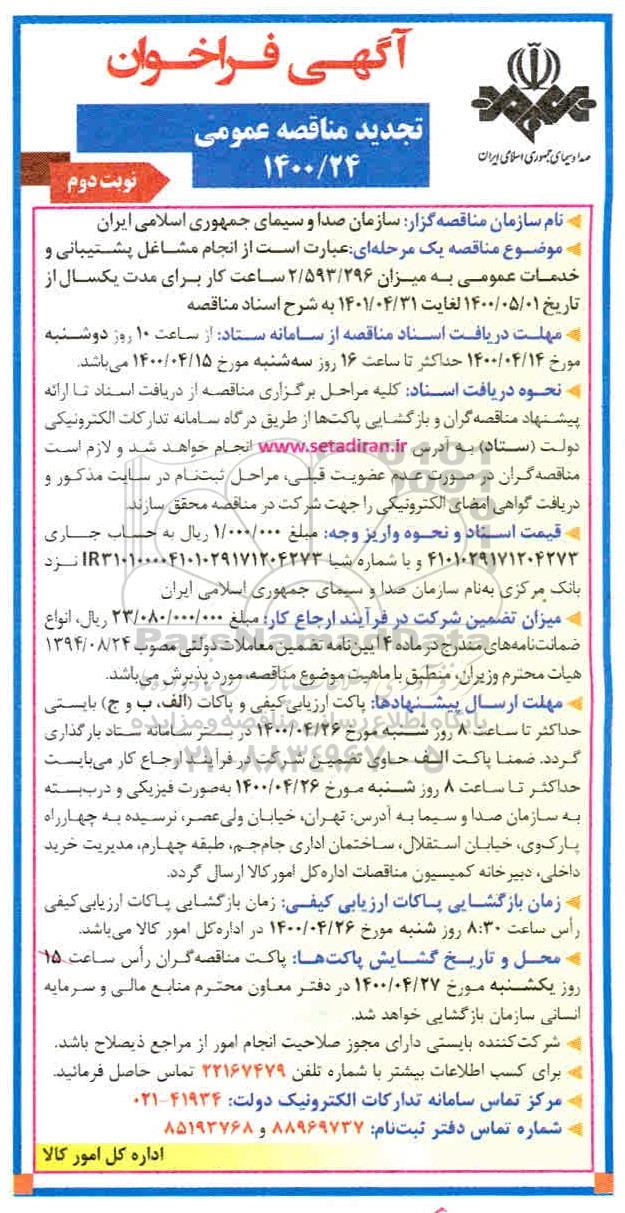 - نام سازمان مناقصه گزار: سازمان صدا و سیمای جمهوری اسلامی ایران