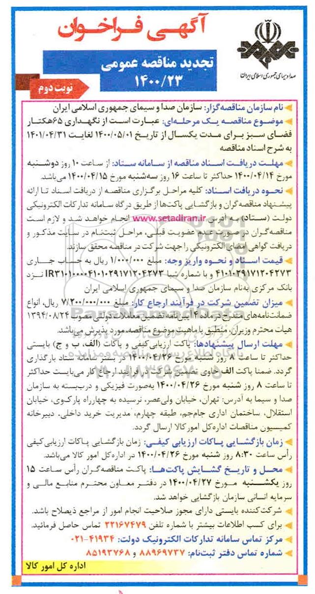 - نام سازمان مناقصه گزار: سازمان صدا و سیمای جمهوری اسلامی ایران