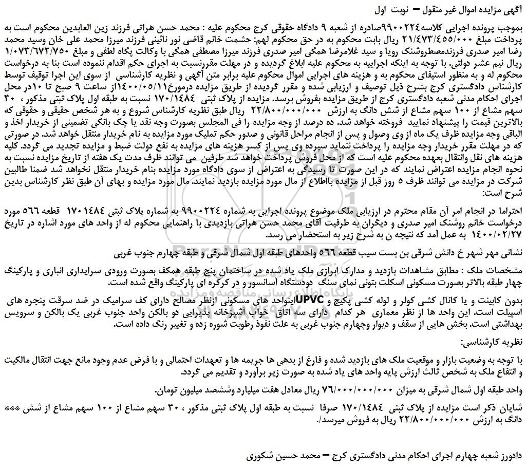 بموجب پرونده اجرایی کلاسه9900224صادره از شعبه 9 دادگاه حقوقی کرج محکوم علیه : محمد حسن هراتی فرزند زین العابدین محکوم است به پرداخت مبلغ 21/473/455/000 ریال بابت محکوم به در حق محکوم لهم: حشمت خانم قاضی نور نائینی فرزند میرزا محمد علی خان وسید محمد رضا امیر صدری فرزندمصطروشنک رویا و سید غلامرضا همگی امیر صدری فرزند میرزا مصطفی همگی با وکالت پگاه لطفی و مبلغ 1/073/672/750 ریال نیم عشر دولتی. با توجه به اینکه اجراییه به محکوم علیه ابلاغ گردیده و در مهلت مقررنسبت به اجرای حکم اقدام ننموده است بنا به درخواست محکوم له و به منظور استیفای محکوم به و هزینه های اجرایی اموال محکوم علیه برابر متن آگهی و نظریه کارشناسی  از سوی این اجرا توقیف توسط کارشناس دادگستری کرج بشرح ذیل توصیف و ارزیابی شده و مقرر گردیده از طریق مزایده درمورخ1400/05/11از ساعت 9 صبح تا 10در محل اجرای احکام مدنی شعبه دادگستری کرج از طریق مزایده بفروش برسد. مزایده از پلاک ثبتی  170/1484 نسبت به طبقه اول پلاک ثبتی مذکور ،  30 سهم مشاع از 100 سهم مشاع از شش دانگ به ارزش  22/800/000/000  ریال طبق نظریه کارشناس شروع و به هر شخص حقیقی و حقوقی که بالاترین قیمت را پیشنهاد نمایید  فروخته خواهد شد. ده درصد از وجه مزایده را فی المجلس بصورت وجه نقد یا چک بانکی تضمینی از خریدار اخذ و الباقی وجه مزایده ظرف یک ماه از وی وصول و پس از انجام مراحل قانونی و صدور حکم تملیک مورد مزایده به نام خریدار منتقل خواهد شد. در صورتی که در مهلت مقرر خریدار وجه مزایده را پرداخت ننماید سپرده وی پس از کسر هزینه های مزایده به نفع دولت ضبط و مزایده تجدید می گردد. کلیه هزینه های نقل وانتقال بعهده محکوم علیه است که از محل فروش پرداخت خواهد شد طرفین  می توانند ظرف مدت یک هفته از تاریخ مزایده نسبت به نحوه انجام مزایده اعتراض نمایند که در این صورت تا رسیدگی به اعتراض از سوی دادگاه مورد مزایده بنام خریدار منتقل نخواهد شد ضمنا طالبین شرکت در مزایده می توانند ظرف 5 روز قبل از مزایده بااطلاع از مال مورد مزایده بازدید نمایند. مال مورد مزایده و بهای آن طبق نظر کارشناس بدین شرح است: