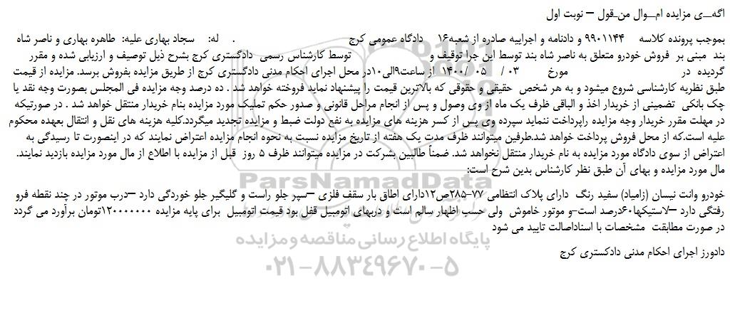 بموجب پرونده کلاسه 9901144 و دادنامه و اجراییه صادره از شعبه16 دادگاه عمومی کرج . له: سجاد بهاری علیه: طاهره بهاری و ناصر شاه بند مبنی بر فروش خودرو متعلق به ناصر شاه بند توسط این جرا توقیف و توسط کارشناس رسمی دادگستری کرج بشرح ذیل توصیف و ارزیابی شده و مقرر گردیده در مورخ 03 / 05 /1400 از ساعت9الی10در محل اجرای احکام مدنی دادگستری کرج از طریق مزایده بفروش برسد. مزایده از قیمت طبق نظریه کارشناسی شروع میشود و به هر شخص حقیقی و حقوقی که بالاترین قیمت را پیشنهاد نماید فروخته خواهد شد . ده درصد وجه مزایده فی المجلس بصورت وجه نقد یا چک بانکی تضمینی از خریدار اخذ و الباقی ظرف یک ماه از وی وصول و پس از انجام مراحل قانونی و صدور حکم تملیک مورد مزایده بنام خریدار منتقل خواهد شد . در صورتیکه در مهلت مقرر خریدار وجه مزایده راپرداخت ننماید سپرده وی پس از کسر هزینه های مزایده به نفع دولت ضبط و مزایده تجدید میگردد.کلیه هزینه های نقل و انتقال بعهده محکوم علیه است.که از محل فروش پرداخت خواهد شد.طرفین میتوانند ظرف مدت یک هفته از تاریخ مزایده نسبت به نحوه انجام مزایده اعتراض نمایند که در اینصورت تا رسیدگی به اعتراض از سوی دادگاه مورد مزایده به نام خریدار منتقل نخواهد شد. ضمناً طالبین بشرکت در مزایده میتوانند ظرف 5 روز قبل از مزایده با اطلاع از مال مورد مزایده بازدید نمایند. مال مورد مزایده و بهای آن طبق نظر کارشناس بدین شرح است: