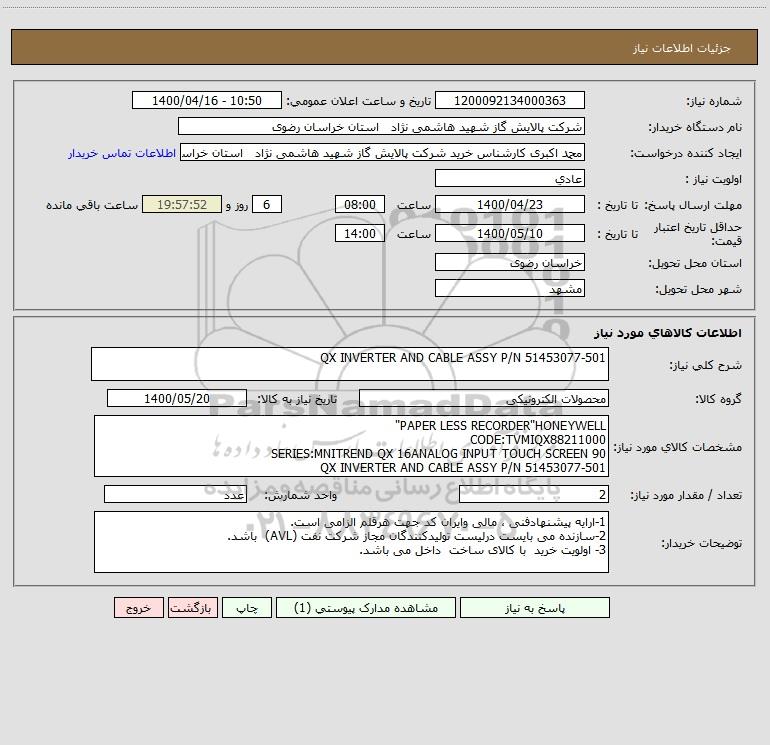 نام دستگاه خریدار:شرکت پالایش گاز شهید هاشمی نژاد استان خراسان رضوی